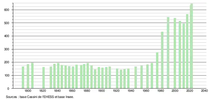 L'évolution du nombre d'habitants est connue à travers les recensements de la population effectués dans la commune depuis 1793. Pour les communes de moins de 10 000 habitants, une enquête de recensement portant sur toute la population est réalisée tous les cinq ans, les populations de référence des années intermédiaires étant quant à elles estimées par interpolation ou extrapolation[19]. Pour la commune, le premier recensement exhaustif entrant dans le cadre du nouveau dispositif a été réalisé en 2006[20].