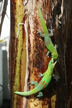 Phelsuma laticauda sur un tronc à Hawaii.