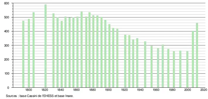 - ↑ Par convention dans Wikipédia, le principe a été retenu de n’afficher dans le tableau des recensements et le graphique, pour les populations légales postérieures à 1999, que les populations correspondant à une enquête exhaustive de recensement pour les communes de moins de 10 000 habitants, et que les populations des années 2006, 2011, 2016, etc. pour les communes de plus de 10 000 habitants, ainsi que la dernière population légale publiée par l’Insee pour l'ensemble des communes.