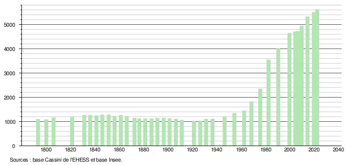 L'évolution du nombre d'habitants est connue à travers les recensements de la population effectués dans la commune depuis 1793. Pour les communes de moins de 10 000 habitants, une enquête de recensement portant sur toute la population est réalisée tous les cinq ans, les populations de référence des années intermédiaires étant quant à elles estimées par interpolation ou extrapolation[18]. Pour la commune, le premier recensement exhaustif entrant dans le cadre du nouveau dispositif a été réalisé en 2004[19].