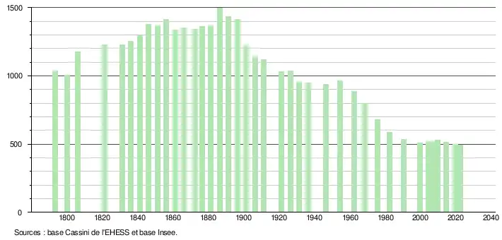 L'évolution du nombre d'habitants est connue à travers les recensements de la population effectués dans la commune depuis 1793. Pour les communes de moins de 10 000 habitants, une enquête de recensement portant sur toute la population est réalisée tous les cinq ans, les populations de référence des années intermédiaires étant quant à elles estimées par interpolation ou extrapolation[24]. Pour la commune, le premier recensement exhaustif entrant dans le cadre du nouveau dispositif a été réalisé en 2004[25].