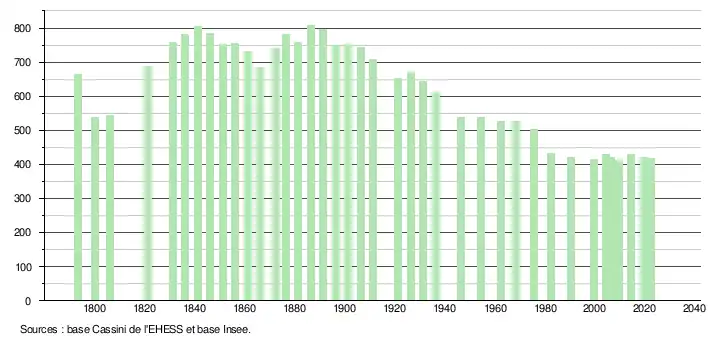L'évolution du nombre d'habitants est connue à travers les recensements de la population effectués dans la commune depuis 1793. Pour les communes de moins de 10000habitants, une enquête de recensement portant sur toute la population est réalisée tous les cinqans, les populations de référence des années intermédiaires étant quant à elles estimées par interpolation ou extrapolation[13]. Pour la commune, le premier recensement exhaustif entrant dans le cadre du nouveau dispositif a été réalisé en 2004[14].