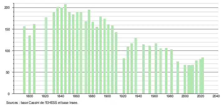 L'évolution du nombre d'habitants est connue à travers les recensements de la population effectués dans la commune depuis 1793. Pour les communes de moins de 10 000 habitants, une enquête de recensement portant sur toute la population est réalisée tous les cinq ans, les populations de référence des années intermédiaires étant quant à elles estimées par interpolation ou extrapolation[29]. Pour la commune, le premier recensement exhaustif entrant dans le cadre du nouveau dispositif a été réalisé en 2004[30].