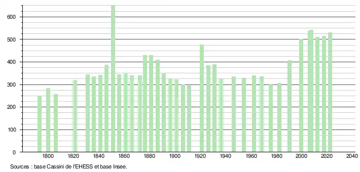 - ↑ Fiches Insee - Populations de référence de la commune pour les années 2006, 2007, 2008, 2009, 2010, 2011, 2012, 2013, 2014, 2015, 2016, 2017, 2018, 2019, 2020, 2021 et 2022.