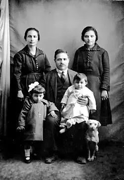 Debout de gauche à droite, sa mère Panayotta, son père François Philippe, sa cousine germaine Constantina Tsiropoulou. Devant, sa soeur Eleni et sur les genoux de son père, Yannis agé d'un an, Athènes, circa 1924