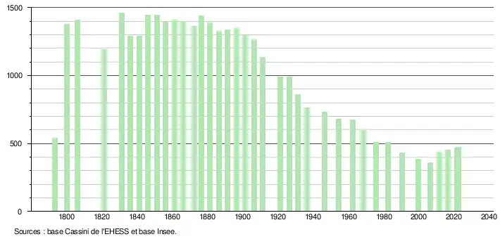 L'évolution du nombre d'habitants est connue à travers les recensements de la population effectués dans la commune depuis 1793. Pour les communes de moins de 10 000 habitants, une enquête de recensement portant sur toute la population est réalisée tous les cinq ans, les populations de référence des années intermédiaires étant quant à elles estimées par interpolation ou extrapolation[19]. Pour la commune, le premier recensement exhaustif entrant dans le cadre du nouveau dispositif a été réalisé en 2006[20].