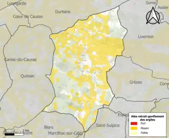 Le retrait-gonflement des sols argileux est susceptible d'engendrer des dommages importants aux bâtiments en cas d’alternance de périodes de sécheresse et de pluie. 47,8 % de la superficie communale est en aléa moyen ou fort (67,7 % au niveau départemental et 48,5 % au niveau national). Sur les 268 bâtiments dénombrés sur la commune en 2019, 81 sont en aléa moyen ou fort, soit 30 %, à comparer aux 72 % au niveau départemental et 54 % au niveau national. Une cartographie de l'exposition du territoire national au retrait gonflement des sols argileux est disponible sur le site du BRGM[28],[Carte 2].