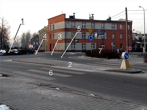 1. Îlot central 2. Îlot séparateur ou refuge 3. Chaussée annulaire 4. Bande franchissable (tablier pour camions) 5. Ligne de cédez le passage 6. Passage piéton accessible 7. Environnement paysagé[1]