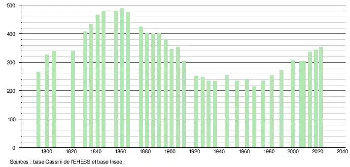 L'évolution du nombre d'habitants est connue à travers les recensements de la population effectués dans la commune depuis 1793. Pour les communes de moins de 10 000 habitants, une enquête de recensement portant sur toute la population est réalisée tous les cinq ans, les populations de référence des années intermédiaires étant quant à elles estimées par interpolation ou extrapolation[28]. Pour la commune, le premier recensement exhaustif entrant dans le cadre du nouveau dispositif a été réalisé en 2008[29].