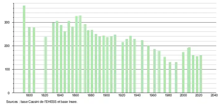 - ↑ Fiches Insee - Populations de référence de la commune pour les années 2006, 2007, 2008, 2009, 2010, 2011, 2012, 2013, 2014, 2015, 2016, 2017, 2018, 2019, 2020, 2021 et 2022.