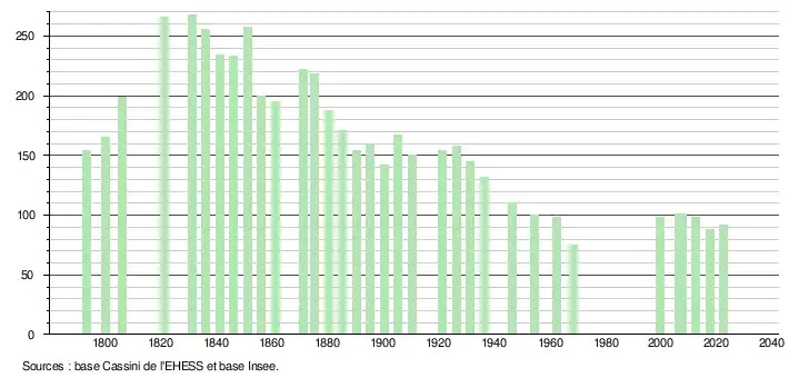 L'évolution du nombre d'habitants est connue à travers les recensements de la population effectués dans la commune depuis 1793. Pour les communes de moins de 10 000 habitants, une enquête de recensement portant sur toute la population est réalisée tous les cinq ans, les populations de référence des années intermédiaires étant quant à elles estimées par interpolation ou extrapolation[17]. Pour la commune, le premier recensement exhaustif entrant dans le cadre du nouveau dispositif a été réalisé en 2007[18].