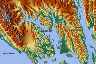 Le Chaînon Fairweather est le nom non officiel d'une chaîne de montagnes située dans l'État américain de l'Alaska et dans la province canadienne de la Colombie-Britannique. C'est la chaîne la plus au sud des montagnes de Saint Elias. La section la plus au nord de l'aire de répartition est située dans le parc provincial Tatshenshini-Alsek tandis que la section la plus au sud réside dans le parc national de Glacier Bay[30] dans la zone de recensement de Hoonah-Angoon[31]. Entre les deux, il passe par le coin sud-est de l'arrondissement de Yakutat. Les sommets de cette plage comprennent le mont Fairweather, le point culminant de la Colombie-Britannique et le mont Quincy Adams de 4 150 m[32].