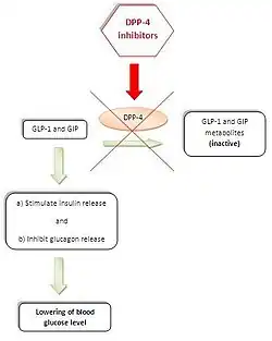 La DPP-4 est une enzyme qui inactive les incrétines : glucagon-like peptide-1 (GLP-1) et gastric inhibitory polypeptide ou glucose-dependent insulinotropic peptide (GIP). L'inhibition de la DPP-4 entraîne une augmentation importante de la concentration de GLP-1 et de GIP qui provoquent une augmentation de la sécrétion d'insuline et une diminution de la sécrétion de glucagon, propriété permettant d'améliorer l'équilibre en sucre chez le diabétique. Les gliptines font ainsi partie des molécules jouant sur l'augmentation du taux d'incrétine, les autres étant des analogues de cette dernière : exénatide et liraglutide.