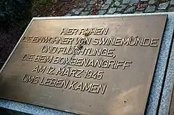 Sur une plaque au sol on peut lire l'inscription suivante : "Nous nous souvenons des nombreux morts inconnus qui ont perdu la vie le 12 mars 1945 à Swinemünde et ont été ensevelis ici dans des fosses communes. Vous qui êtes en vie, assurez vous que la paix demeure. Souvenez vous aussi des soldats, de réfugiés et habitants de la ville de Swinemünde qui sont morts lors du bombardement et entérrés sous le ruines de la ville."