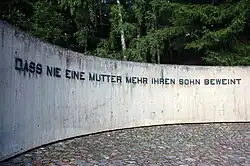 Prévu à l'origine, un relief a été abandonné pour des raisons à la fois financières et artistiques. L'inscription a été retirée par des inconnus le 3 septembre 2009. Le Volksbund a ensuite fait installer de nouvelles lettres en plastique de couleur bronze en février 2010. Ceux-ci ont également été retirés le 27 juin 2010 par des auteurs jusque-là inconnus.