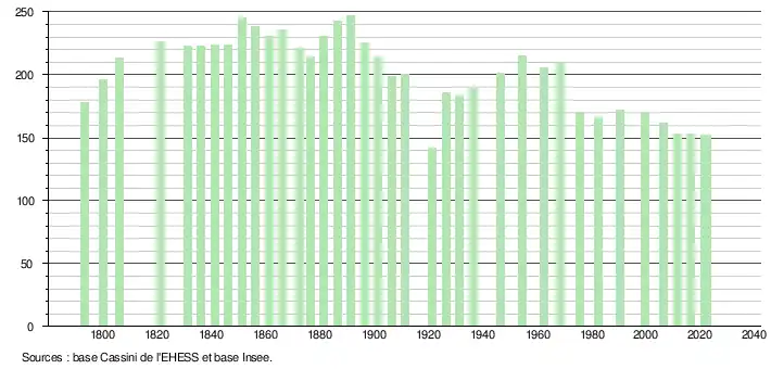 L'évolution du nombre d'habitants est connue à travers les recensements de la population effectués dans la commune depuis 1793. Pour les communes de moins de 10 000 habitants, une enquête de recensement portant sur toute la population est réalisée tous les cinq ans, les populations de référence des années intermédiaires étant quant à elles estimées par interpolation ou extrapolation[35]. Pour la commune, le premier recensement exhaustif entrant dans le cadre du nouveau dispositif a été réalisé en 2006[36].