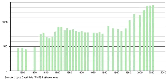 L'évolution du nombre d'habitants est connue à travers les recensements de la population effectués dans la commune depuis 1793. Pour les communes de moins de 10 000 habitants, une enquête de recensement portant sur toute la population est réalisée tous les cinq ans, les populations de référence des années intermédiaires étant quant à elles estimées par interpolation ou extrapolation[23]. Pour la commune, le premier recensement exhaustif entrant dans le cadre du nouveau dispositif a été réalisé en 2007[24].