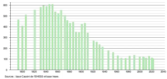 L'évolution du nombre d'habitants est connue à travers les recensements de la population effectués dans la commune depuis 1793. Pour les communes de moins de 10 000 habitants, une enquête de recensement portant sur toute la population est réalisée tous les cinq ans, les populations de référence des années intermédiaires étant quant à elles estimées par interpolation ou extrapolation[34]. Pour la commune, le premier recensement exhaustif entrant dans le cadre du nouveau dispositif a été réalisé en 2005[35].