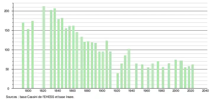 L'évolution du nombre d'habitants est connue à travers les recensements de la population effectués dans la commune depuis 1793. Pour les communes de moins de 10 000 habitants, une enquête de recensement portant sur toute la population est réalisée tous les cinq ans, les populations de référence des années intermédiaires étant quant à elles estimées par interpolation ou extrapolation[26]. Pour la commune, le premier recensement exhaustif entrant dans le cadre du nouveau dispositif a été réalisé en 2007[27].