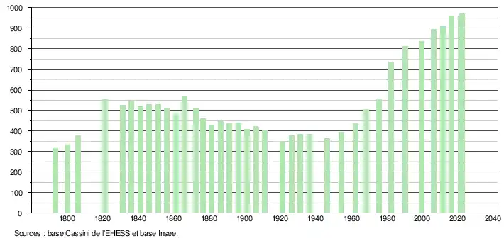 L'évolution du nombre d'habitants est connue à travers les recensements de la population effectués dans la commune depuis 1793. Pour les communes de moins de 10 000 habitants, une enquête de recensement portant sur toute la population est réalisée tous les cinq ans, les populations de référence des années intermédiaires étant quant à elles estimées par interpolation ou extrapolation[31]. Pour la commune, le premier recensement exhaustif entrant dans le cadre du nouveau dispositif a été réalisé en 2006[32].