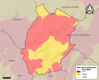Le retrait-gonflement des sols argileux est susceptible d'engendrer des dommages importants aux bâtiments en cas d’alternance de périodes de sécheresse et de pluie. La totalité de la commune est en aléa moyen ou fort (84,7 % au niveau départemental et 48,5 % au niveau national). Sur les 192 bâtiments dénombrés sur la commune en 2019, 192 sont en aléa moyen ou fort, soit 100 %, à comparer aux 86 % au niveau départemental et 54 % au niveau national. Une cartographie de l'exposition du territoire national au retrait gonflement des sols argileux est disponible sur le site du BRGM[21],[22].