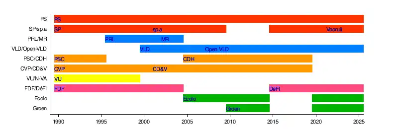 GroenEcoloDéFIDéFIVolksunieChristen-Democratisch en VlaamsChristen-Democratisch en VlaamsCentre démocrate humanisteCentre démocrate humanisteOpen Vlaamse Liberalen en DemocratenOpen Vlaamse Liberalen en DemocratenMouvement réformateur (Belgique)Parti réformateur libéral (Belgique)Vooruit (parti politique)Socialistische Partij AndersSocialistische Partij AndersParti socialiste (Belgique)