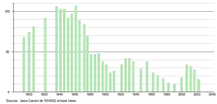 L'évolution du nombre d'habitants est connue à travers les recensements de la population effectués dans la commune depuis 1793. Pour les communes de moins de 10 000 habitants, une enquête de recensement portant sur toute la population est réalisée tous les cinq ans, les populations de référence des années intermédiaires étant quant à elles estimées par interpolation ou extrapolation[29]. Pour la commune, le premier recensement exhaustif entrant dans le cadre du nouveau dispositif a été réalisé en 2006[30].