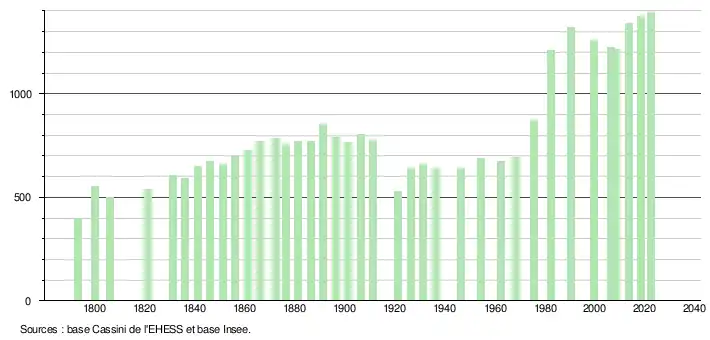 L'évolution du nombre d'habitants est connue à travers les recensements de la population effectués dans la commune depuis 1793. Pour les communes de moins de 10 000 habitants, une enquête de recensement portant sur toute la population est réalisée tous les cinq ans, les populations de référence des années intermédiaires étant quant à elles estimées par interpolation ou extrapolation[31]. Pour la commune, le premier recensement exhaustif entrant dans le cadre du nouveau dispositif a été réalisé en 2008[32].