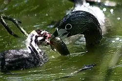 Les petits, nidifuges, sont capables de quitter le nid une heure après leur éclosion, et sont souvent portés sur le dos de leurs parents, qui peuvent les nourrir dans cette posture, voire plonger avec leur progéniture. Les petits peuvent aussi s'accrocher avec leur bec à la queue d'un des parents et se faire ainsi entraîner, ce qui leur permet une fuite plus rapide en cas de menace. L'âge auquel les petits prennent leur indépendance est très variable, de 1 à 2 mois.