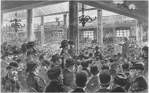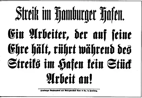 - ↑ Grüttner 1981, p. 149 ; Grüttner 1984a, p. 173 ; Legien 1897, p. 85. Grüttner dit clairement que des grévistes ont participé en grand nombre à ces heurts, tandis que Legien le réfute pour des raisons tactiques, car ces tumultes auraient provoqué des réactions anti-syndicales.