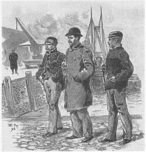 Le 21 novembre 1896, presque tous les dockers ont cessé le travail. Les autres groupes de travailleurs portuaires commencent aussi à se mettre en grève à partir des jours suivants, et présentent des demandes qui sont fermement rejetées par les entrepreneurs. Elles diffèrent selon les métiers, et on peut globalement les classer en trois groupes, selon qu'elles se portent sur le salaire de base, les primes ou le temps de travail[21]. À cela s'ajoute parfois une demande de négociation des conditions de travail par accord collectif ; les syndicats n'ont encore en effet jusqu'ici jamais été perçus par les entrepreneurs comme des partenaires avec lesquels ces derniers devraient négocier.