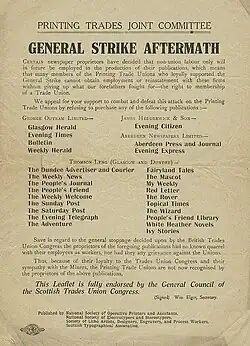 Le , le TUC, par la voix d'Ernest Bevin, annonça pour le à minuit un débrayage général en soutien aux mineurs. Entre le 1er et le , d'ultimes tentatives de négociations entre gouvernement, syndicats et patronat ne débouchèrent sur aucun accord, du fait de la tension sociale et de l'intransigeance des deux parties en conflit[10]. Les antagonismes de classes étaient alors très puissants : les ouvriers étaient tout aussi déterminés au combat que les cercles patronaux et conservateurs qui tenaient à « donner une leçon aux trade-unions, voire à les briser »[11]. La tension n'était pas limitée au secteur des mines : par exemple, à la dernière minute avant l'impression de l'édition du du Daily Mail, les ouvriers imprimeurs refusèrent de publier un éditorial hostile à la grève générale intitulé For King and Country (« Pour le roi et pour le pays »), dans la mesure où on pouvait y lire qu'« une grève générale n'est pas un conflit confiné à un secteur de l'industrie mais représente une menace pour le gouvernement et l'État de droit »[N 2].