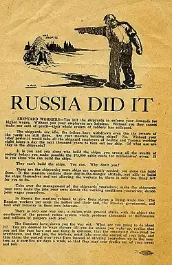 - ↑ (en) « The Russians have shown you the way out. What are you going to do about it? You are doomed to wage slavery till you die unless you wake up, realize that you and the boss have nothing in common, that the employing class must be overthrown, and that you, the workers, must take over the control of your jobs, and through them, the control over your lives instead of offering yourself up to the masters as a sacrifice six days a week, so that they may coin profits out of your sweat and toil. »