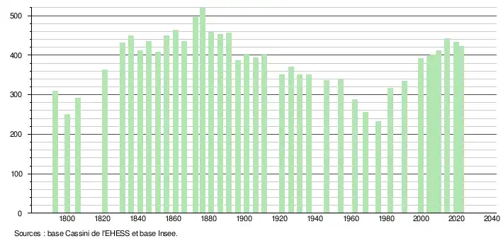 L'évolution du nombre d'habitants est connue à travers les recensements de la population effectués dans la commune depuis 1793. Pour les communes de moins de 10 000 habitants, une enquête de recensement portant sur toute la population est réalisée tous les cinq ans, les populations de référence des années intermédiaires étant quant à elles estimées par interpolation ou extrapolation[25]. Pour la commune, le premier recensement exhaustif entrant dans le cadre du nouveau dispositif a été réalisé en 2004[26].