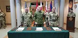 Simon Trudeau, grand prévôt des Forces canadiennes, au centre, lors d'une rencontre en 2019 avec ses homologues américain et britannique.