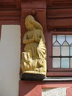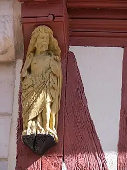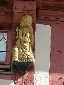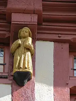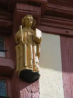 Maison à colombages rouges et blancs sur rue, en pierre sur cour, sa façade comporte des statuettes dorées de saints protecteurs[2]. Dans la cour, au revers de la maison, subsiste une belle tour d'escalier avec une porte gothique largement sculptée[3].