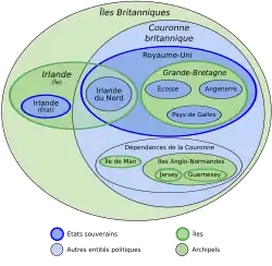 En 1801, la couronne d'Irlande, que les Anglais tenaient depuis le XIIe siècle, fusionna à son tour avec la Couronne britannique, créant ainsi le « Royaume-Uni de Grande-Bretagne et d'Irlande », ou simplement le Royaume-Uni : cette fusion ne fut jamais acceptée par le clergé catholique d'Irlande, car cela revenait à soumettre l'île au chef de l'Église anglicane et au pouvoir des protestants. Après plus d'un siècle de luttes, l’État libre d'Irlande quitta le royaume en 1922, le laissant avec le nom de « Royaume-Uni de Grande-Bretagne et d'Irlande du Nord ».