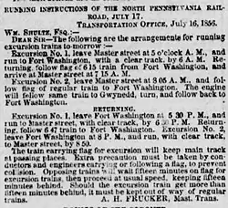 Le , à la demande de la paroisse de Kensington de l'Église catholique romaine de Saint-Michel de Philadelphie (en) souhaitant emmener les élèves de son école du dimanche en excursion à Shaeff's Woods, un bois situé près de la gare de Fort Washington, la compagnie avait mis en place au départ de Cohocksink un train supplémentaire dénommé « Pique-nique Spécial », remorqué par la locomotive «Shackamaxon (en)», conduite par le mécanicien Henry Harris. Son chef de train était Alfred Hoppel. Le nombre de réservations dépassant 1 600, deux voyages avaient été prévus[6]. Le train devait d'abord embarquer la moitié des passagers à 5 heures, les déposer à Fort Washington à 6 heures, puis, après le passage du train régulier venant de Gwynedd, il devait ensuite retourner à Cohocksink pour en repartir avec le reste des excursionnistes à 8 heures[7].