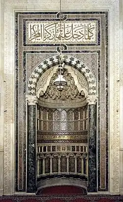 - ↑ Oleg Grabar, La formation de l'art islamique, Flammarion, coll. « Champs », Paris, 2000 (ISBN 2-08-081645-4), p. 146 ; Henri Stierlin, l'Architecture islamique, Paris : PUF, coll. « Que sais-je ? », p. 21. Cependant, les dates peuvent changer d'un auteur à l'autre. FB. Flood (dans The great mosque of Damascus, the making of an Umayyad visual culture, Leyde : Brill, 2001 (ISBN 90-04-11638-9) p. 2) donne les deux dates de 87H/705 et 88H/706. Le site ArchNet, de manière plus étonnante, indique la date de 709.
