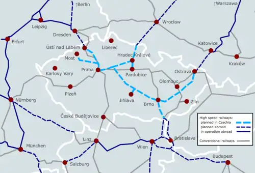 Un réseau ferroviaire à grande vitesse et République tchèque est prévu, avec une construction planifié pour 2026 et une vitesse maximale comprise entre 200 et 320 km/h. Bien que České Dráhy possède et exploite plusieurs matériels roulants capables d'atteindre des vitesses de 230 km/h depuis 2004, il n’existe, en 2024, aucune infrastructure capable d’atteindre une vitesse supérieure à 200 km/h. La seule exception est la voie de 13,3 kilomètres du circuit d'essai ferroviaire de Velim avec une vitesse maximale autorisée de 230 km/h pour les trains pendulaires et jusqu'à 210 km/h pour les trains conventionnels[2]. Le fabricant tchèque de matériel roulant Škoda Transportation produit du matériel roulant à grande vitesse depuis les années 1970 .