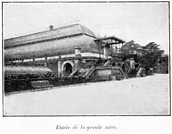 - Les serres : au fil du XVIIe siècle, le Jardin commence à se doter de vraies serres, dont la structure portante est une armature de baguettes de bois sertissant des carreaux de verre. Ces premières serres n'ont pas été conservées mais à l'époque elles étaient déjà conçues pour y entreposer toute l'année, et pas seulement en hiver, des spécimens botaniques exotiques collectés lors de voyages d'exploration. La première serre de ce type, dite « serre chaude », avait été commandée par Charles Bouvard (1572-1658). Plus tard, les plus remarquables serres du XVIIIe siècle ont été principalement édifiée par Joseph Pitton de Tournefort qui peu avant sa mort, en 1708, fit inaugurer deux serres chaudes[2]. Ensuite, en 1714, Sébastien Vaillant fit construire une nouvelle serre chaude, puis encore une autre en 1717. Buffon, quant à lui, en fera édifier une en 1788. Par les termes « serre chaude » ou « serre tempérée » on se référait à l'époque au fait que ces serres contenaient en elles des plantes provenant de climats chauds. Au XIXe siècle, les avancées techniques des serres anglaises permettent à l'architecte Charles Rohault de Fleury, de retour d'un voyage à Londres, de concevoir et faire construire entre 1833 et 1836 un ensemble de grandes serres qui ne dépendent plus de l'orientation au soleil parce qu'elles sont chauffées à la vapeur. Pour le projet d'origine, Charles Rohault de Fleury avait dessiné un ensemble plus vaste mais seulement deux pavillons furent construits et inaugurés en 1836, les actuelles serres dites de Nouvelle-Calédonie (ancienne serre mexicaine) et de l'histoire des plantes (ancienne serre australienne). Plus tard, en 1850, Rohault de Fleury prévit de compléter les deux serres existantes par une serre monumentale. Celle-ci ne fut pas réalisée mais remplacée par celle inaugurée seulement en 1889, ce bien après la mort de Charles Rohault de Fleury.