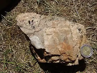 - quartz - grains globuleux arrondis de 1 à 3 millimètres de diamètre, pouvant former des agglomérats de 1 à 3 centimètres de diamètre − 26 % en volume