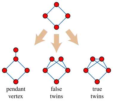 - Le graphe peut être construit à partir d'un sommet unique par une séquence d'opérations qui ajoutent un nouveau sommet pendant (de degré un) ou qui dupliquent un sommet existant sous réserve que le nouveau sommet dupliqué est adjacent à son jumeau (vrai jumeaux) sauf si les voisins des jumeaux forment une clique. Ces trois opérations, produisent tous les graphe à distance héréditaire. Pour obtenir tous les graphes ptolémaïques, il ne suffit pas d'utiliser des sommets pendants et de vrais jumeaux ; le cas exceptionnel des faux jumeaux est aussi nécessaire[6].