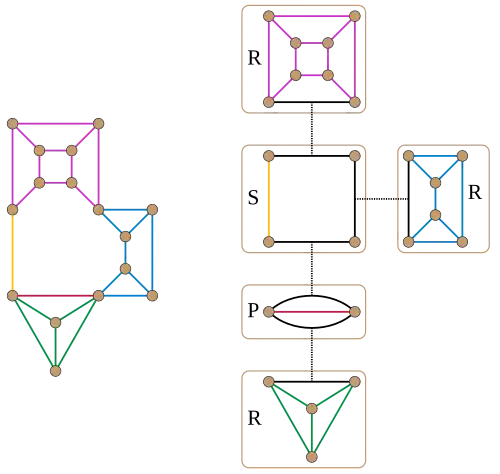 Un arbre SPQR est une structure arborescente qui peut être définie pour un graphe sommet-connexe arbitraire ; à chaque sommet est associé un graphe ou multigraphe. Il a des nœuds source S, qui sont analogues aux opérations de composition en série dans les graphes série-parallèle, des nœuds puits P, qui sont analogues aux opérations de composition parallèle dans les graphes série-parallèle, et des nœuds R, qui ne correspondent pas aux compositions série-parallèle. Un graphe biconnexe est série-parallèle si et seulement s'il n'y a pas de nœuds R dans son arbre SPQR.