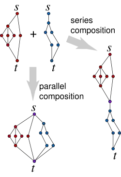 - La composition en série de deux TTG X et Y est le TTG Z créé à partir de l'union disjointe des graphes X et Y en fusionnant le puits de X avec la source de Y. La source de X devient la source de Z et le puits de Y devient le puits de Z .