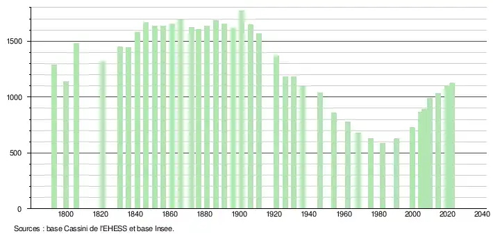 L'évolution du nombre d'habitants est connue à travers les recensements de la population effectués dans la commune depuis 1793. Pour les communes de moins de 10 000 habitants, une enquête de recensement portant sur toute la population est réalisée tous les cinq ans, les populations de référence des années intermédiaires étant quant à elles estimées par interpolation ou extrapolation[19]. Pour la commune, le premier recensement exhaustif entrant dans le cadre du nouveau dispositif a été réalisé en 2004[20].