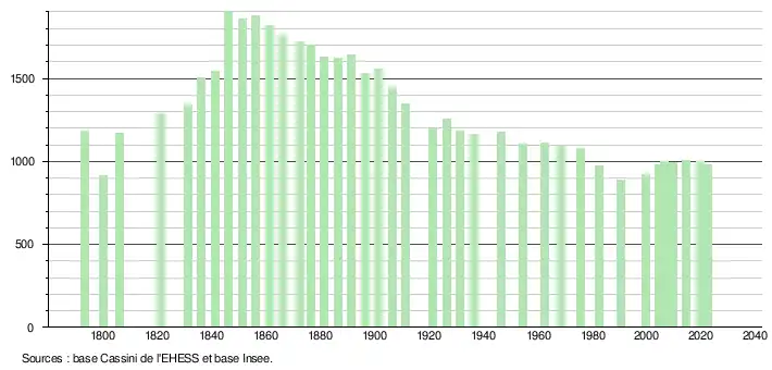 L'évolution du nombre d'habitants est connue à travers les recensements de la population effectués dans la commune depuis 1793. Pour les communes de moins de 10 000 habitants, une enquête de recensement portant sur toute la population est réalisée tous les cinq ans, les populations de référence des années intermédiaires étant quant à elles estimées par interpolation ou extrapolation[19]. Pour la commune, le premier recensement exhaustif entrant dans le cadre du nouveau dispositif a été réalisé en 2004[20].