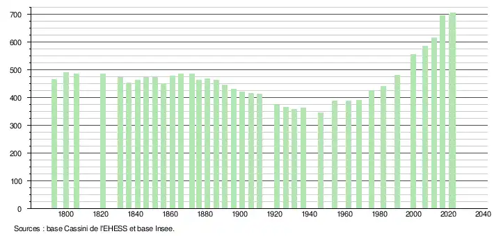 L'évolution du nombre d'habitants est connue à travers les recensements de la population effectués dans la commune depuis 1793. Pour les communes de moins de 10 000 habitants, une enquête de recensement portant sur toute la population est réalisée tous les cinq ans, les populations de référence des années intermédiaires étant quant à elles estimées par interpolation ou extrapolation[21]. Pour la commune, le premier recensement exhaustif entrant dans le cadre du nouveau dispositif a été réalisé en 2006[22].