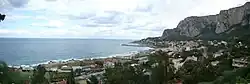 Vue du village d'Addaura sur la cote nord de la Sicile ; Monte Pellegrino se trouve sur la droite et les cavernes surplombent le village depuis la montagne.