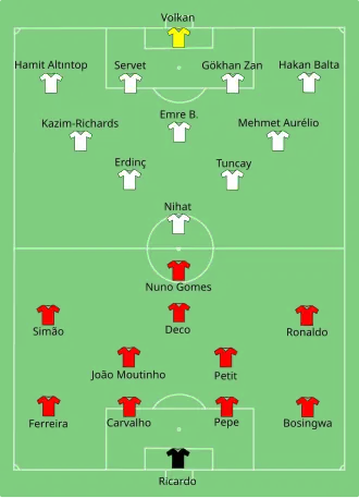 - 7 juin : lors du match Portugal - Turquie, le défenseur central lusitanien Pepe marque un premier but qui est refusé pour une position de hors-jeu sur une tête en début de match avant d'ouvrir le score à la 61e minute à la suite d'un une-deux avec l'attaquant de la seleçao Nuno Gomes. Raúl Meireles scelle la victoire de l'équipe entraînée par Luiz Felipe Scolari pendant les arrêts de jeu de la rencontre. À noter que trois tirs de l'équipe portugaise ont buté sur le poteau (Ronaldo une fois, Nuno Gomes deux fois). Portugal 2, Turquie 0. Classement : Portugal et Tchéquie 3 pts, Suisse et Turquie 0.